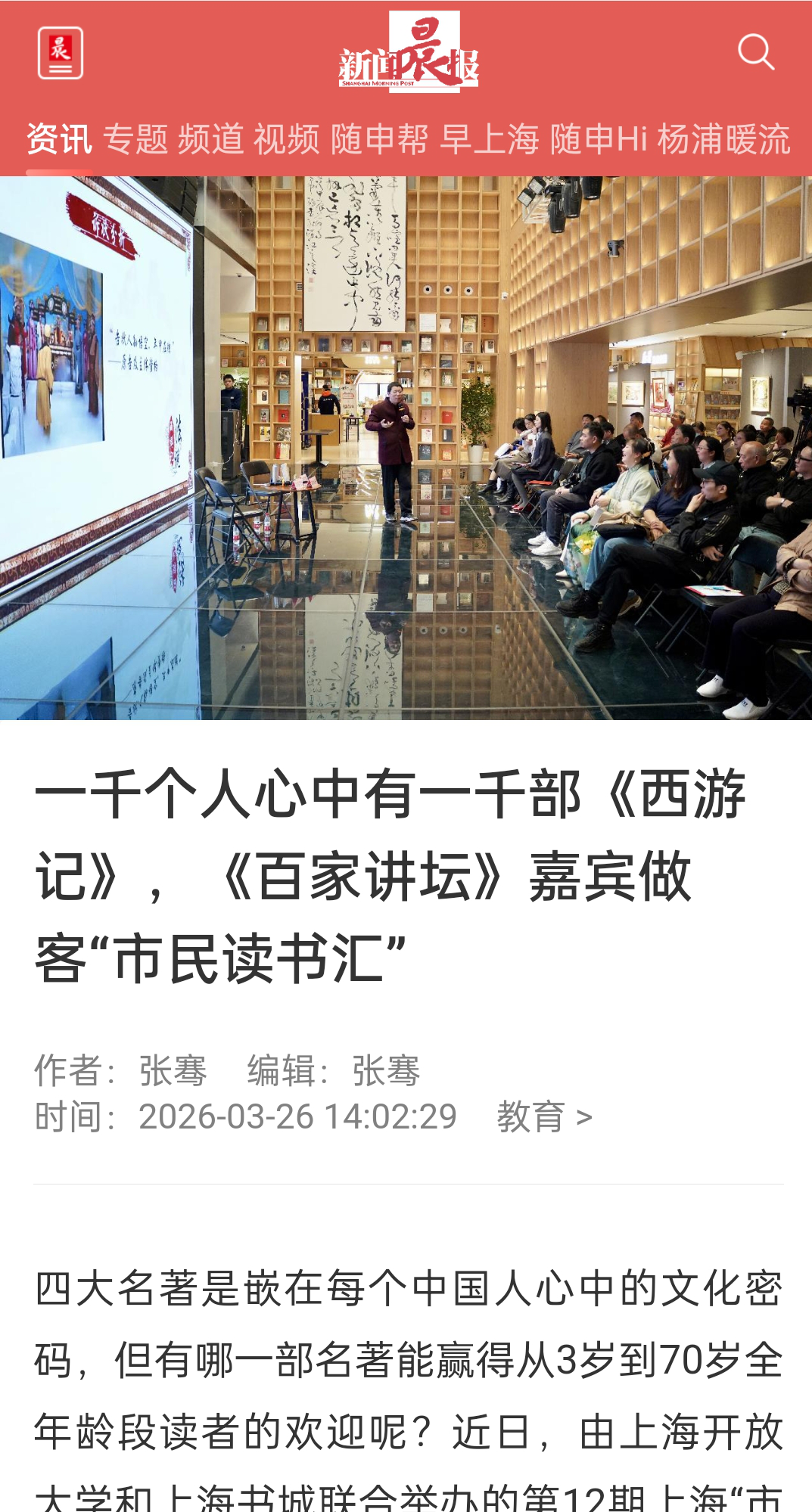 2026年3月22日下午,由上海开放大学和上海书城联合举办的第12期上海“市民读书汇”在上海书城福州路店举行。蒋海松教授带来《<西游记>中的情理法》主题分享。他用新颖的表达方式解锁法治智慧,引发现场掌声和笑声连连。