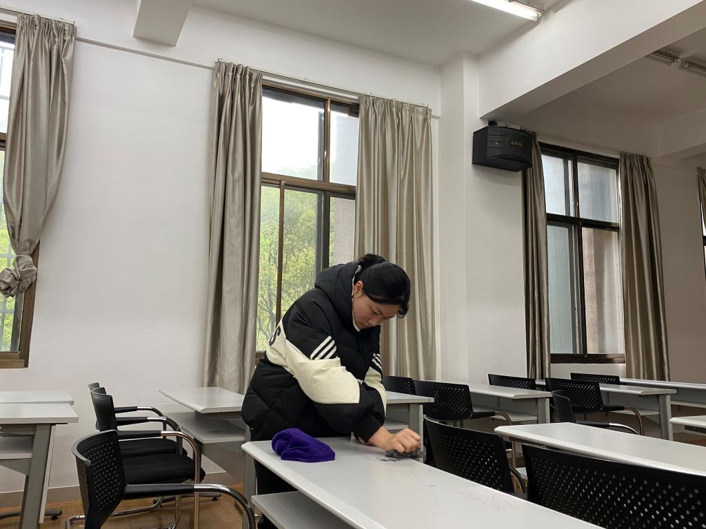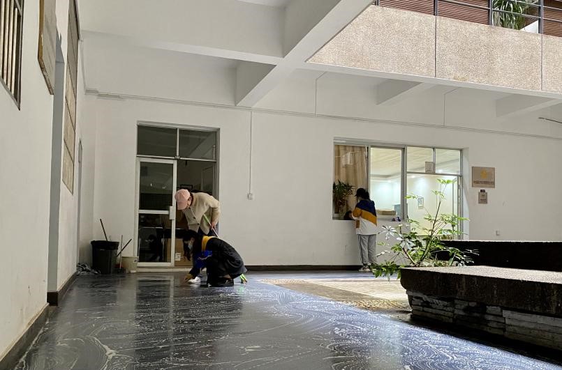 面积较大、日常使用较为频繁的报告厅,清扫难度明显增加。同学们仔细清理每个座位的残留垃圾,不放过每个角落。经过大家的努力,报告厅焕然一新。清扫结束后,各小组由负责人清点本组工具并归还,全体成员在法学楼前合照留念。