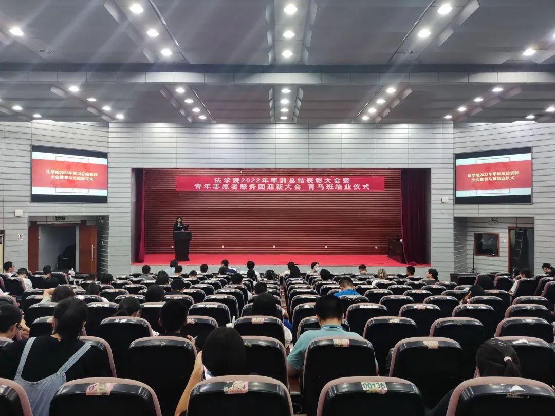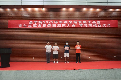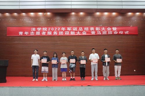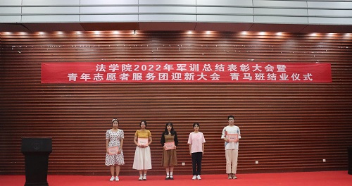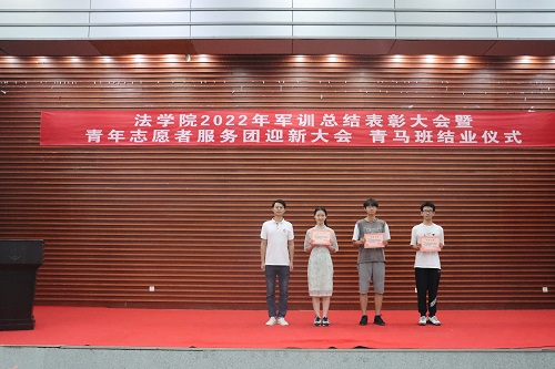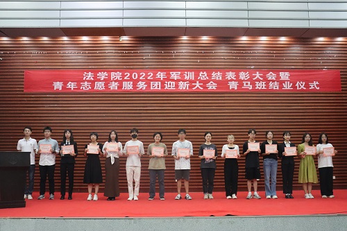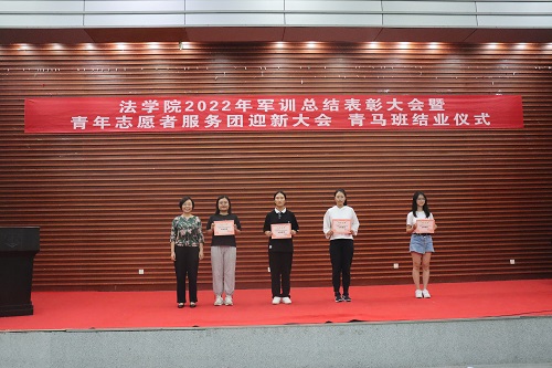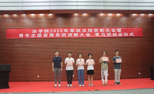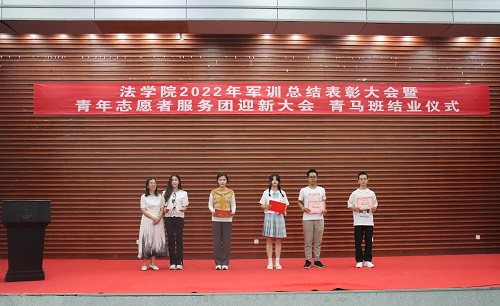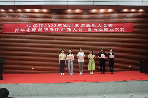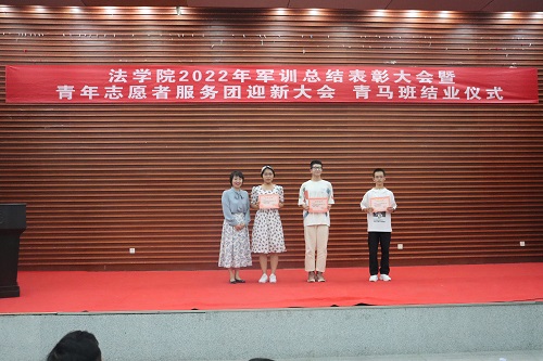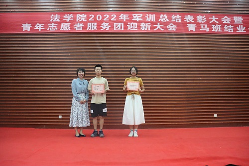 张丹老师宣读表彰决定。学院授予2022级法学三班、法学五班“军训优胜队列班级”荣誉称号,授予2022级法学一班、法学二班、法学四班“作风纪律先进班级”荣誉称号,授予天马一区三栋104寝室等十个寝室军训内务评比“优秀寝室”称号,授予刘亮、贾林远等十五人“军训先进个人”称号,授予姚睿婷、邓舒蔓等十人“青马班优秀学员”称号。学院还对参与2022级新生军训工作的迎新团队成员、换妻