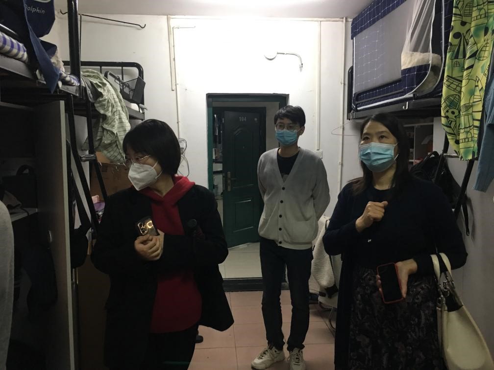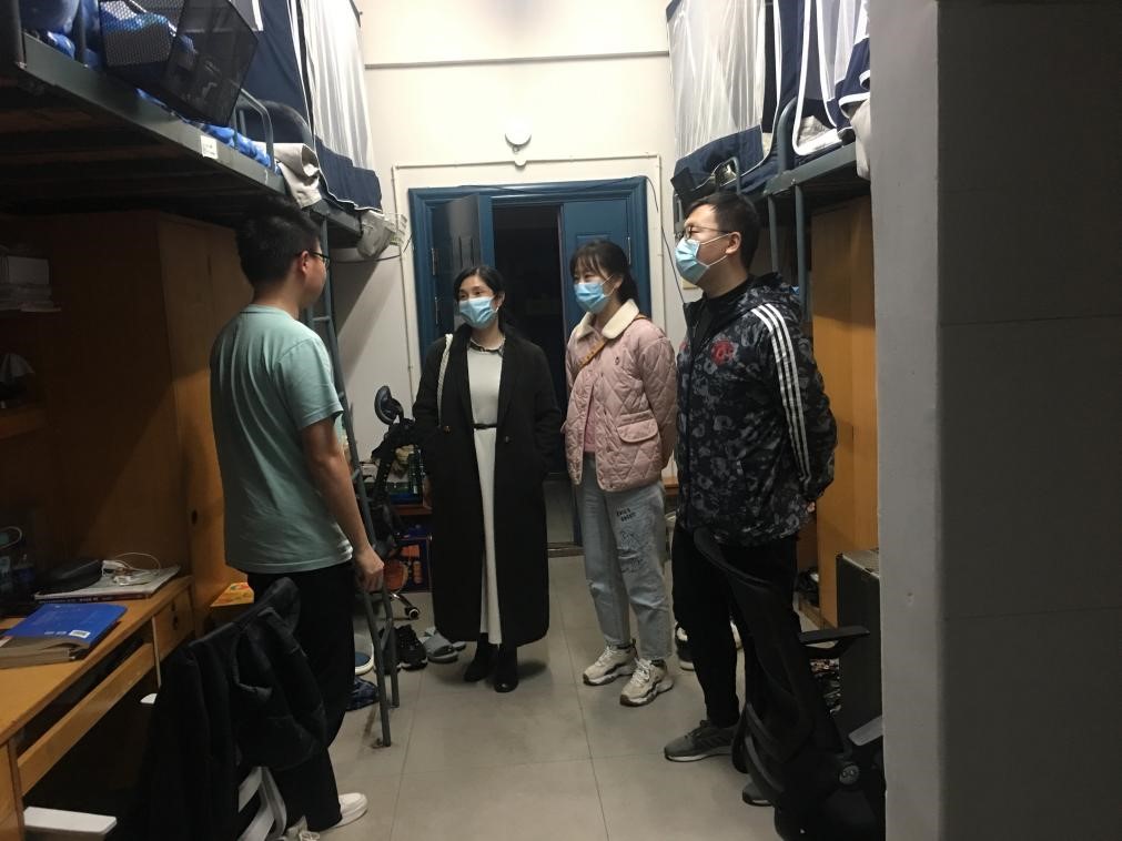 党委副书记、纪委书记罗英老师与班主任代表郭哲老师及本研各年级辅导员老师走入学生宿舍园区,开展学生寝室走访看望及消防安全检查活动。