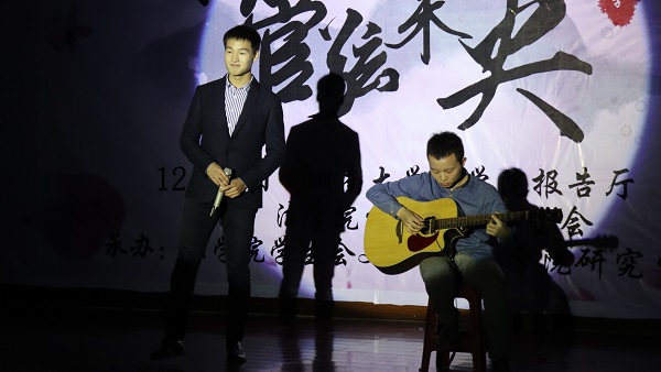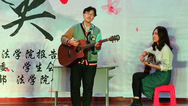 身着民族服装的少数民族同学们走下舞台后,晚会进入了第二个互动环节——“蒙面猜歌王”。十首歌曲,听音乐猜歌名,现场的观众们各出奇招,或挥舞手中的道具,或展示自己的才华,吸引着主持人的注意。在李永罗、钱娅两位主持人的带动下,现场笑料不断,晚会气氛也渐渐走入新的高潮。互动环节结束后,在主持人风趣的对话中,赵高鹿、黎曙光、贺俊峰三位研究生同学走上舞台,为观众们带来歌曲串烧《追光岁月》,动人的歌喉和精彩的吉他伴奏大受好评,更是赢得了不少观众的掌声与尖叫声。随后,由17级法学五班的同学们表演的小品《后宫张嬛传》为现场带来了阵阵欢笑,张子政、谷雨两位同学的反串出演,精湛的演技配合恰到好处的包袱,古灵精怪的对白和出人意料的剧情,令观众们捧腹大笑,拍手称赞,尤其是两位同学滑稽的舞蹈动作,令人印象深刻。