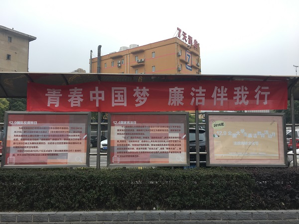 分团委、学生会提前制作了宣传海报和横幅张贴在湖南大学天马学生公寓宣传栏,以学生喜闻乐见的方式宣传廉洁与法治知识。