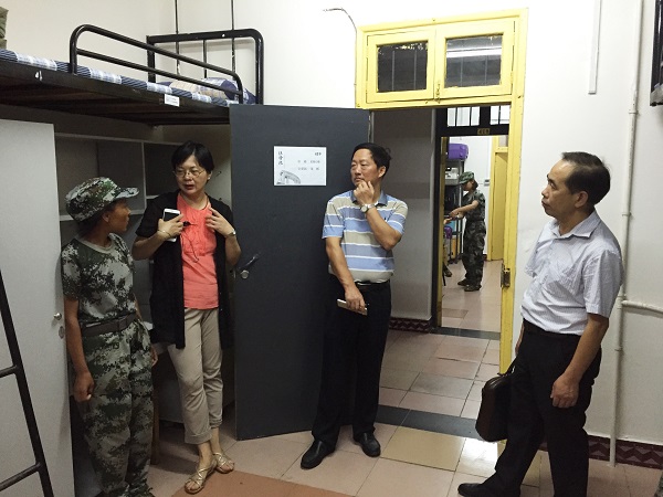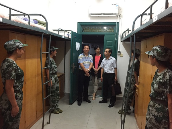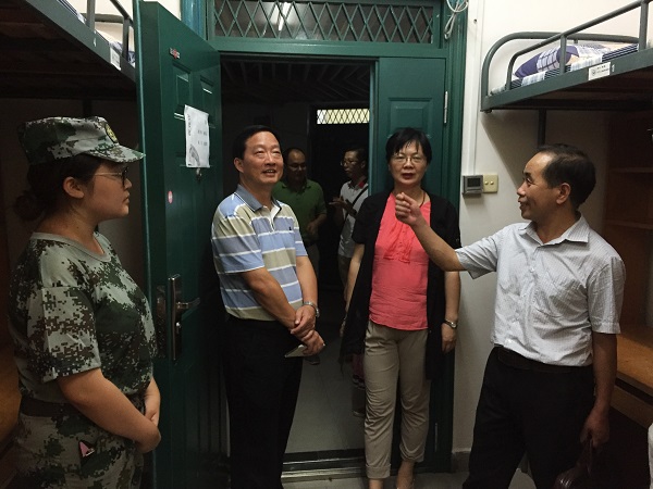 在一区一栋女生宿舍,屈院长、李书记和付书记对照宿舍门上贴的门牌,一一询问新生姓名和毕业学校。“我看了你的军训日记写的很好,感情很真挚,从第一篇到最后一篇我每天都在关注,从日记中看到你的成长和进步很开心”。在法学四班郭格同学的寝室,付书记与郭格同学聊起军训日记中的内容,并鼓励她大学四年要好好学习,综合发展。在少数民族同学考沙尔的寝室,屈院长和李书记仔细询问她的生活情况,并希望寝室同学之间互相尊重民族习惯,互相帮助,把寝室建成“温馨、整洁、团结、舒心”的家。走访过程中,团委书记杨凯向各位领导汇报了换妻