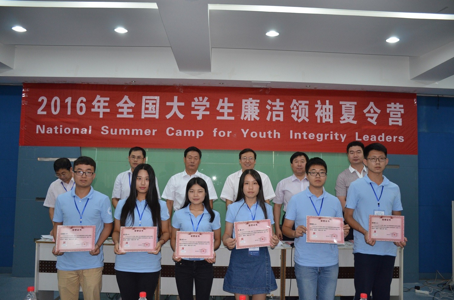 “我自愿加入廉洁行动,终身坚守廉洁、拒绝腐败,推广诚信、服务社会,团结同道、积极进取,为建设廉洁中国而奋斗!”在9日举行的夏令营开营仪式上,来自浙江大学、厦门大学、武汉大学、北京航空航天大学、湖南大学等高校的71名青年大学生用坚定的誓言激励和领悟青年学子的廉洁责任和使命。廉政学会会长、北京航空航天大学任建明教授代表学会在开营仪式上致辞,并发布了2016年廉洁大使名单,湖南大学李宇哲、曹天喆同武汉大学、西安交通大学等全国37所高校的40名在校大学生被授予“廉洁大使”称号。廉政学会副会长、秘书长,湖南大学廉政研究中心执行主任袁柏顺教授宣读了《关于表彰2015年12.9全国大学生廉洁教育活动月优秀组织奖的表彰决定》,湖南大学湖湘廉风学社荣获了“高校活动优秀组织奖”和“地区性活动优秀组织奖”两项荣誉,是参与12.9活动35所高校廉洁社团中唯一一所同时获得两项荣誉的高校。廉政学会会长任建明,副会长兼秘书长袁柏顺、内蒙古大学纪委书记李秀良,社会科学处处长张志忠、团委书记王烨辉,内蒙古自治区廉政研究中心副主任孙凯民等领导向获奖高校颁发了荣誉证书,并向新当选的廉洁大使颁发了徽章和证书。